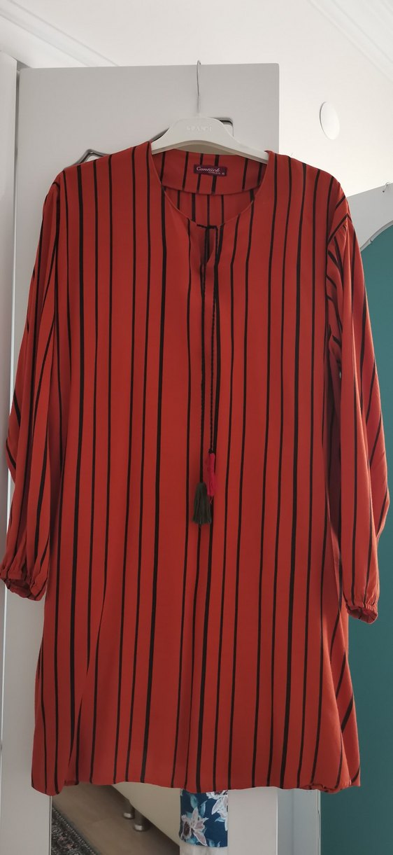 Uzun, bol kesim kadın tunik, turuncu ve siyah çizgilerle yüksek yakalı ve uzun kolludur. Püskül detayları vardır, pamuklu viskon dökümlü kumaştandır, günlük kullanıma uygundur.