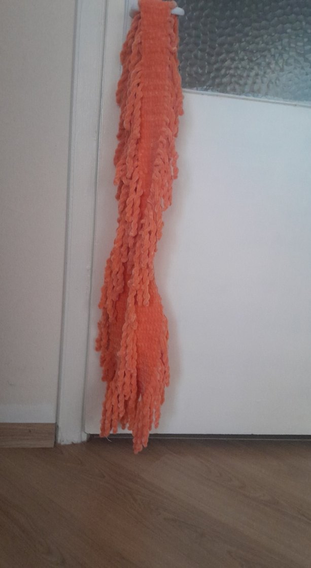 Yumuşak yün kumaştan, canlı turuncu renkte, püsküllü kadın şalı. Rahat ve bohem tarz için uygun.