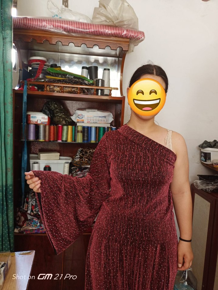 Bordo renkli, uzun kollu ve straplez yakalı, bol kesim şalvar takımı. Parlak kumaş ve püskül detaylarıyla bohem, retro tarzını yansıtıyor. 42_44 beden giyebilir giyen kişi 75-80 kilo arasıydı