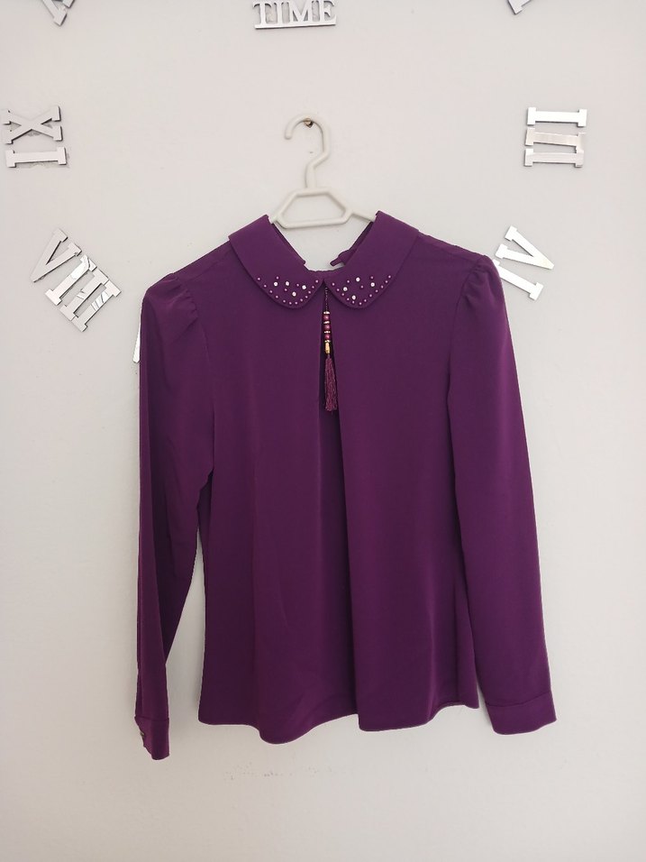 Mor uzun kollu, yakalı kadın gömleği. Püskül detayıyla minimalist ve parlak ipeksi kumaştan, salaş kesim.