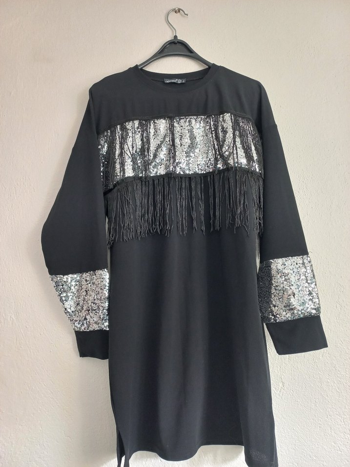 Siyah, uzun kollu, bol kesim tunik, püskül ve gümüş-gri baskılı detaylarla bohem tarzını yansıtıyor. ✨Ürün iki kez kullanıldı hiçbir sorunu yoktur bedeni uymadığı için satıyorum.