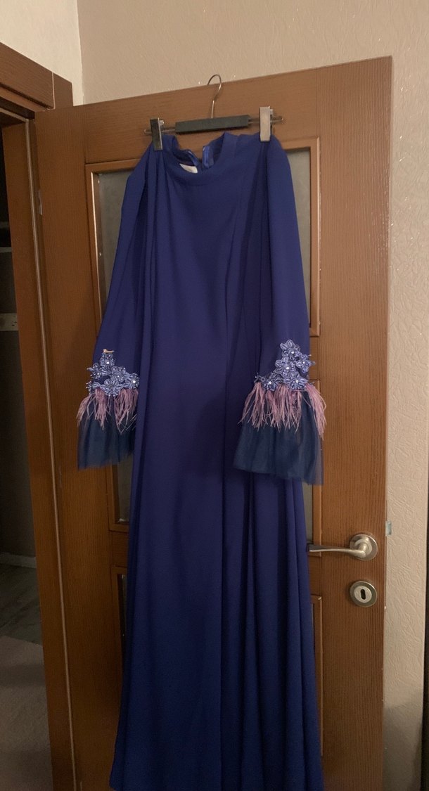 Uzun mor abiye elbise, işlemeli detaylar ve uzun kollarda püsküller içerir. Düzenli kesim, mütevazı bohem stil ve straplez yakaya sahiptir.