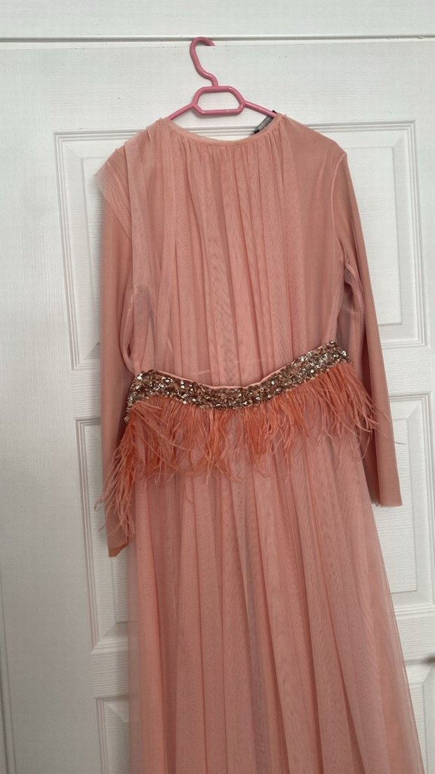 Uzun, bol kesim abiye elbise, tekne yaka ve zarif drapelerle. Uzun kollu, tüylü ve pullu kemer detayıyla düğünlere uygun. Pudra pastel tonunda, sade ve şık.