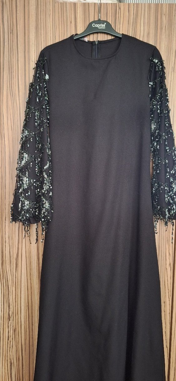 Püsküllü işlemeli uzun kollu, straplez uzun siyah elbise. Bol kesim ve gotik tarzıyla parti için uygun, sentetik kumaştan yapılmıştır. ✨