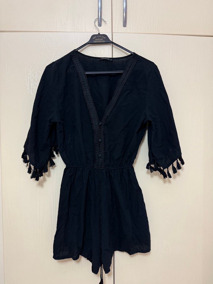 V yaka ve kısa kollu, püsküllü detaylara sahip siyah bol kesim pareo.Sayılı giyildi