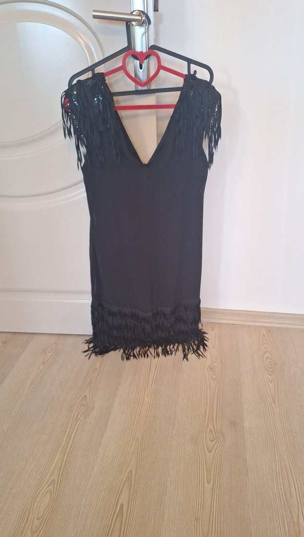 Siyah, kolsuz, v yaka, püsküllü ve işlemeli desenli mini elbise, fit kesimiyle parti için uygundur.