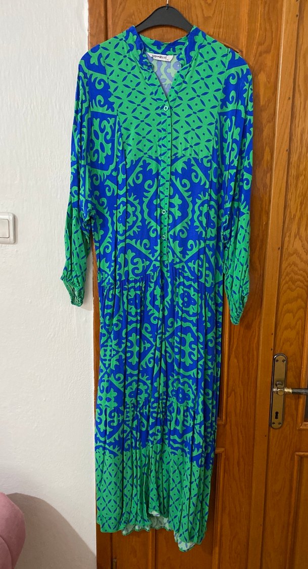 Renkli uzun elbise, bol kesim, uzun kollu ve V yakalıdır. Sentetik kumaştan, canlı batik desenli ve püskül detaylıdır, bohem tarzı için uygundur.