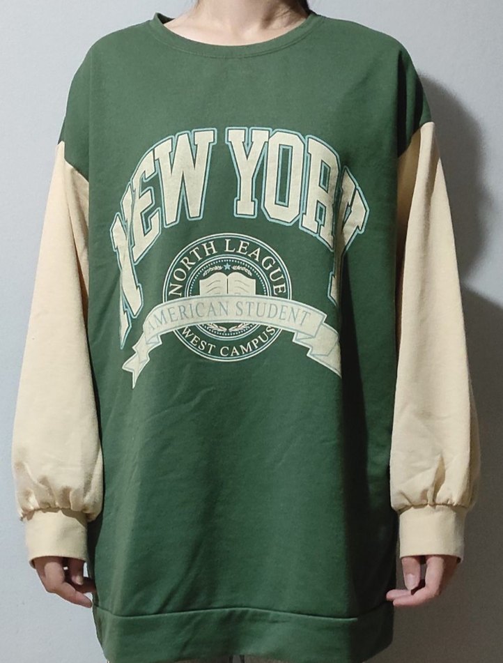Püsküllü detaylı, baskılı "NEW YORK" yazılı, yeşil renkli, uzun kollu, yuvarlak yaka, bol kesim kadın sweatshirtü.