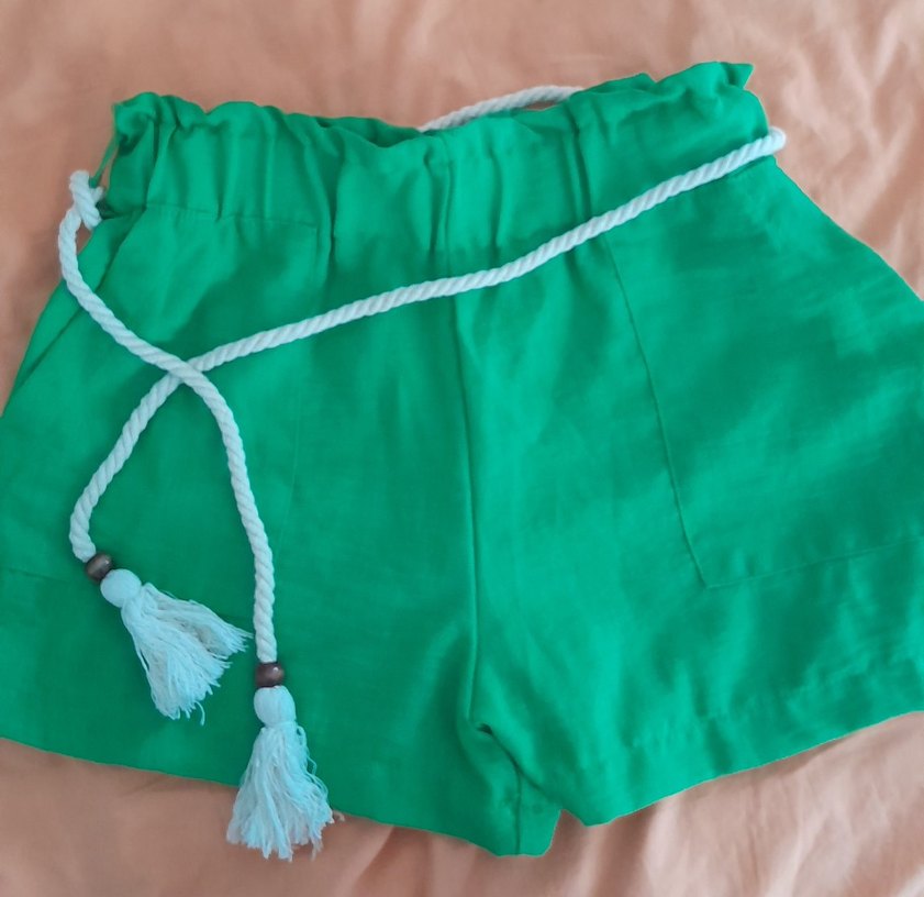 Yumuşak keten kumaştan yapılmış, püsküllü detaylı, bol kesim yeşil keten şort.