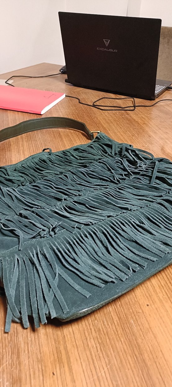 Yeşil süet malzemeden yapılmış, püskül detaylı ve baskılı desenli bohem tarzda kadın çantasıdır.