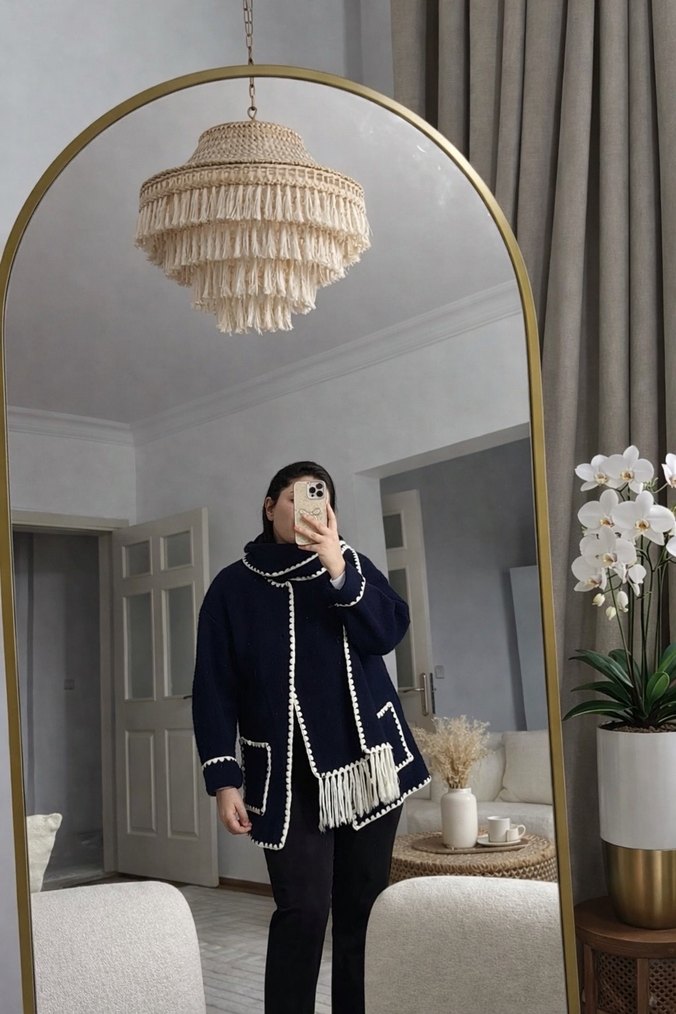 Uzun kollu, yüksek yakalı ve bol kesim mavi triko ceket. Püskül detaylarıyla midi boyda, günlük kullanıma uygun rahat bir model.