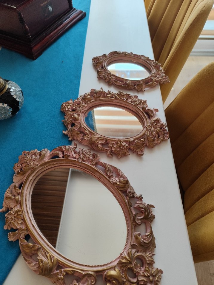 Detaylı çiçek desenli çerçevelere sahip, parlak bej oval aynalar seti. .üçlü kusursuz duvar aksesuarı çık tatlı rengi duruşu ihtiyaç fazlasıdır .aksesuar sevenler alabilir onyillik değerlidir..indirim istemeyiniz zaten uyguna koydum piyasa değerinden çok dusuk
