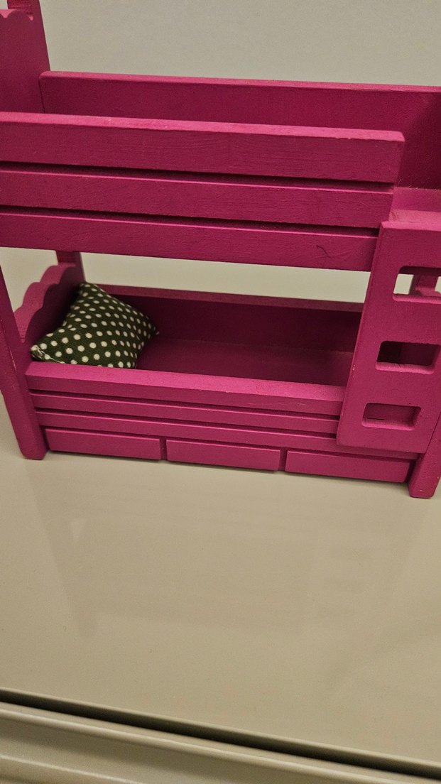 Koyu pembe renkte ahşap çocuk ranza, küçük puantiyeli yastık ile birlikte, merdiven detaylara sahiptir. ️