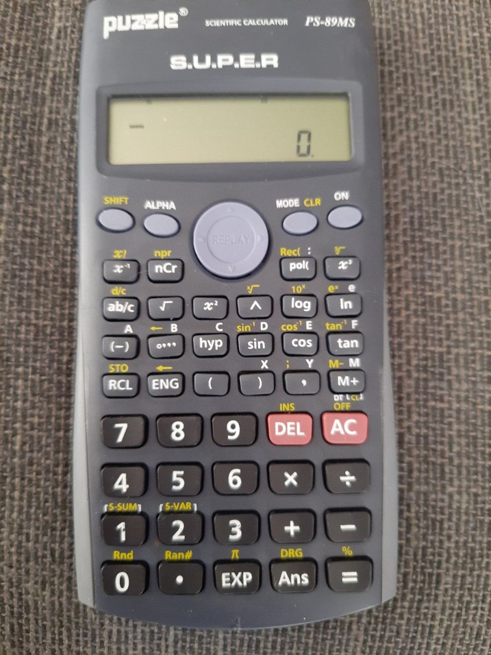 Puzzle PS-89MS bilimsel hesap makinesi, gri renkte olup trigonometrik, logaritmik ve üstel fonksiyon tuşlarına sahiptir. DEL, AC, EXP ve Ans gibi fonksiyonlar içerir.