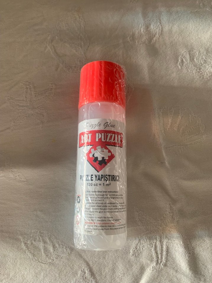 120 cc hacminde, kırmızı kapaklı puzzle yapıştırıcı, puzzle parçalarını birleştirmek için kullanılır.