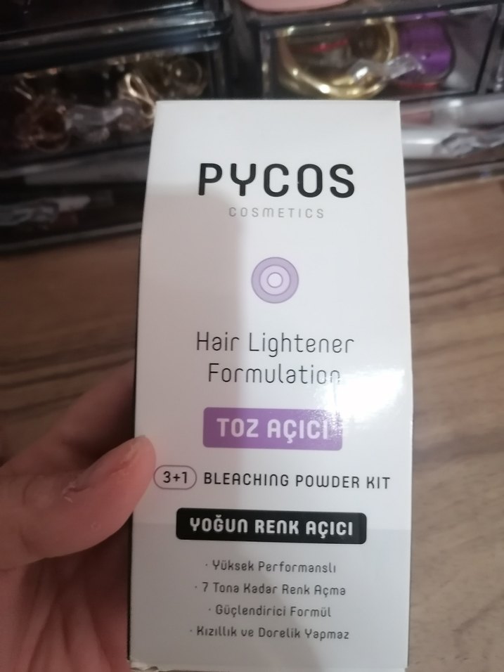 Pycos marka siyah kutuda kozmetik amaçlı toz açıcı beyazlatıcı toz. Açıcı özellik taşır. ✨ Saç boyası