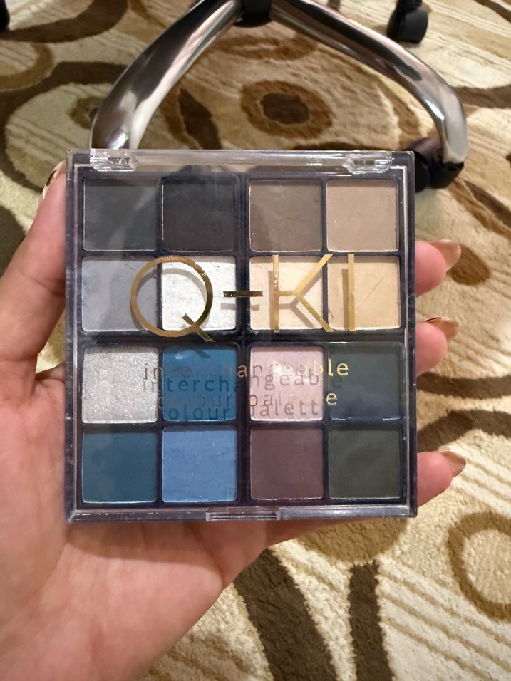 Q-Kİ göz farı paleti, koyu ve canlı mavi, gri ve doğal tonlardan oluşan renk karışımı sunar.
