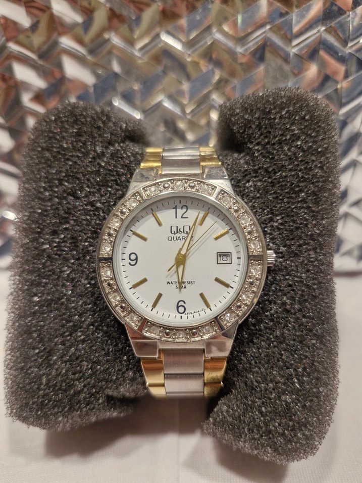Q&Q marka, 35 mm quartz mekanizmalı bayan kol saati satılıktır. Çelik kordonlu olup altın–gümüş renk kombinasyonuna sahiptir. Tarih göstergelidir, cam çevresi taş detaylıdır. Saat çalışır durumdadır, pil takılması lazım. Kordon ayarı için fazladan baklalar mevcuttur. Kozmetik durumu fotoğraflarda görüldüğü gibidir.