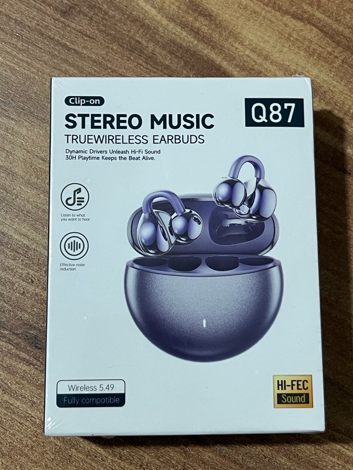 Q87 mor kablosuz kulaklık, klipsli tasarım ve Hi-FEC ses kalitesi sunar. Stereo müzik, etkili gürültü engelleme ve 30 saate kadar kullanım sağlar.