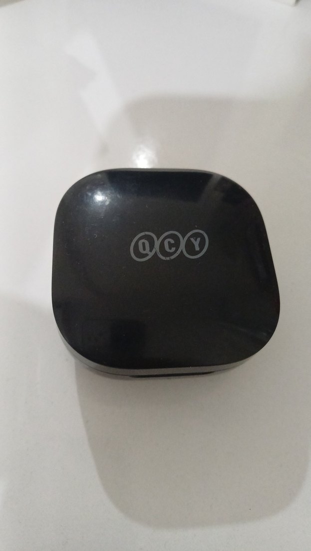 QCY markasına ait siyah kablosuz kulaklıkların şarj kutusu, kompakt tasarıma sahiptir.