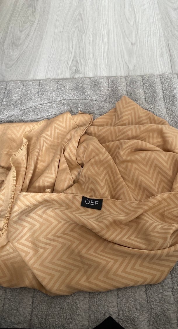 Yumuşak sentetik kumaştan yapılmış, kürk detaylı bej kadın şalı. Modern zikzak desenli ve konfor için gri kürk kenarlı. QEF etiketi bulunur.