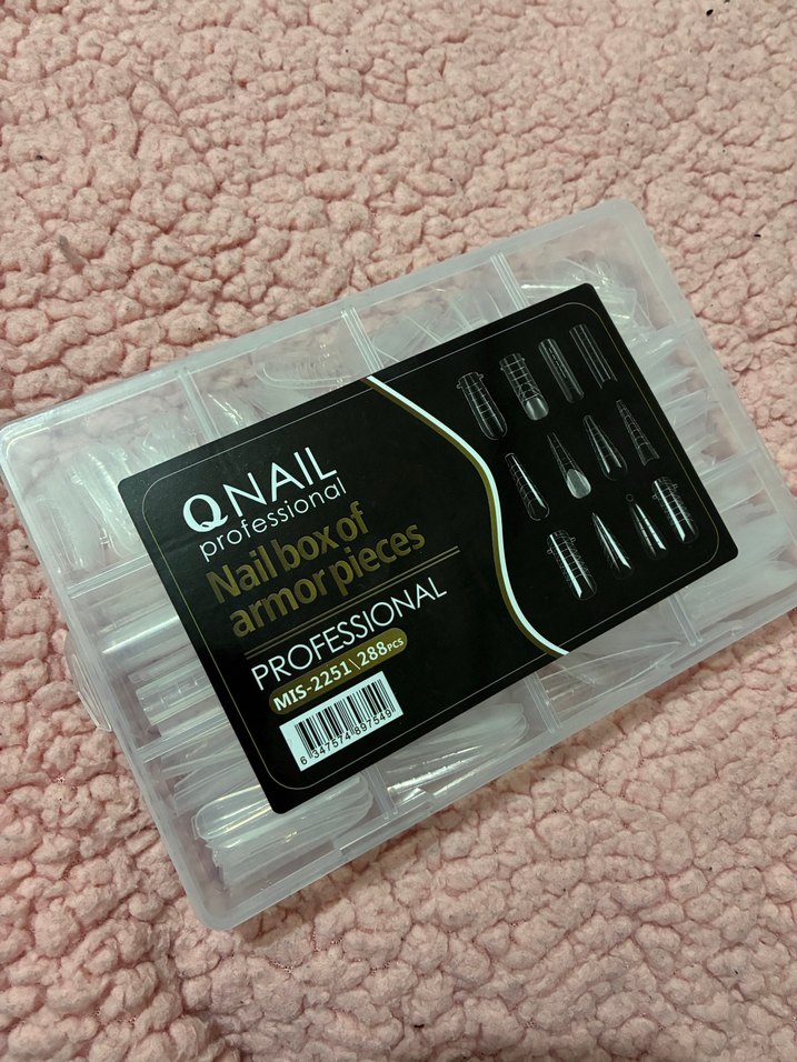 QNAIL profesyonel tırnak kutusunda farklı şekillerde 288 adet şeffaf tırnak tipsi bulunmaktadır. İçerisinde her tırnak yatağına uygun model vardır.