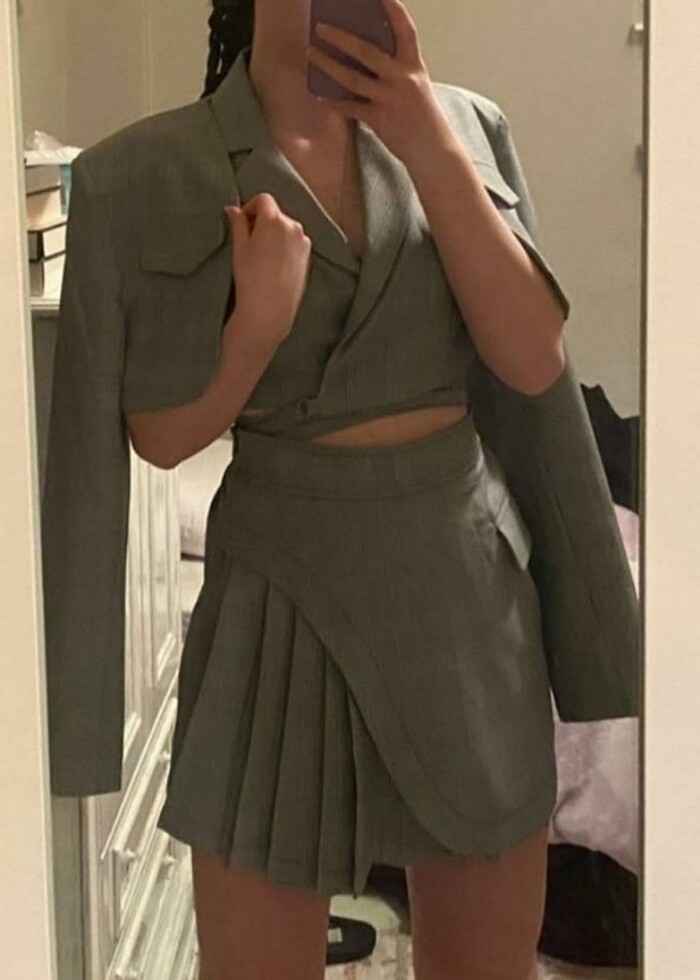 Etek, yelek ve ceketiyle beraber üçlü takım. Ceket M beden, yelek ve etek S beden. Yeleği birkaç kez giydim. Fotograflar aldıgım kisiye ait.