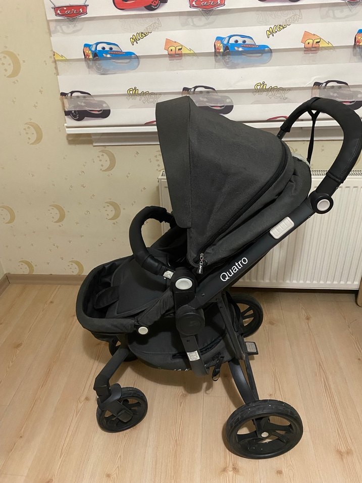 Quatro bebek arabası, siyah ve gri tonlarda sağlam iskelet ve ayarlanabilir tente ile konforlu sürüş sağlar. Yeni doğan için puseti mevcuttur