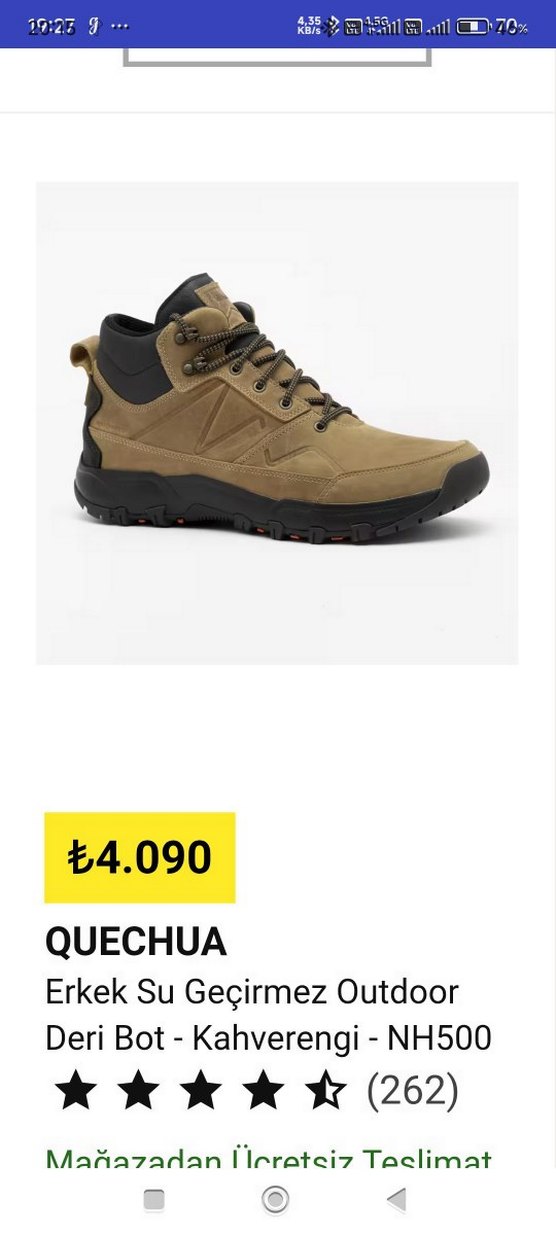 Quechua markalı, kahverengi, su geçirmez outdoor erkek botu. Bağcıklı ve dayanıklı kauçuk tabanlıdır, sokak stili ve günlük kullanıma uygundur.