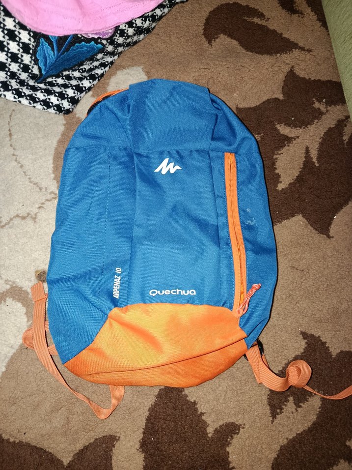 Quechua markalı kadın sırt çantası, mavi ve turuncu sentetik kumaştan ve fermuarlı ön cebinden oluşur. Sokak ve spor tarzlara uygundur.