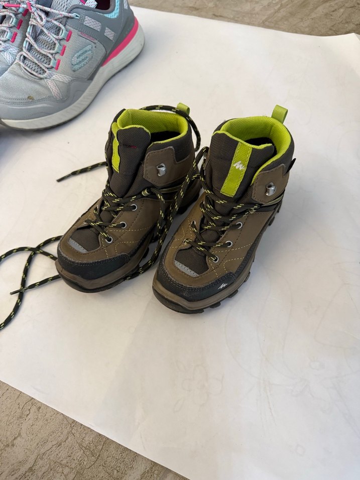 2 3 kez giyildi Kahverengi, Velcro ve bağcıklı, yeşil iç astarlı kauçuk erkek çocuk botu, rahat sokak stili için uygun.