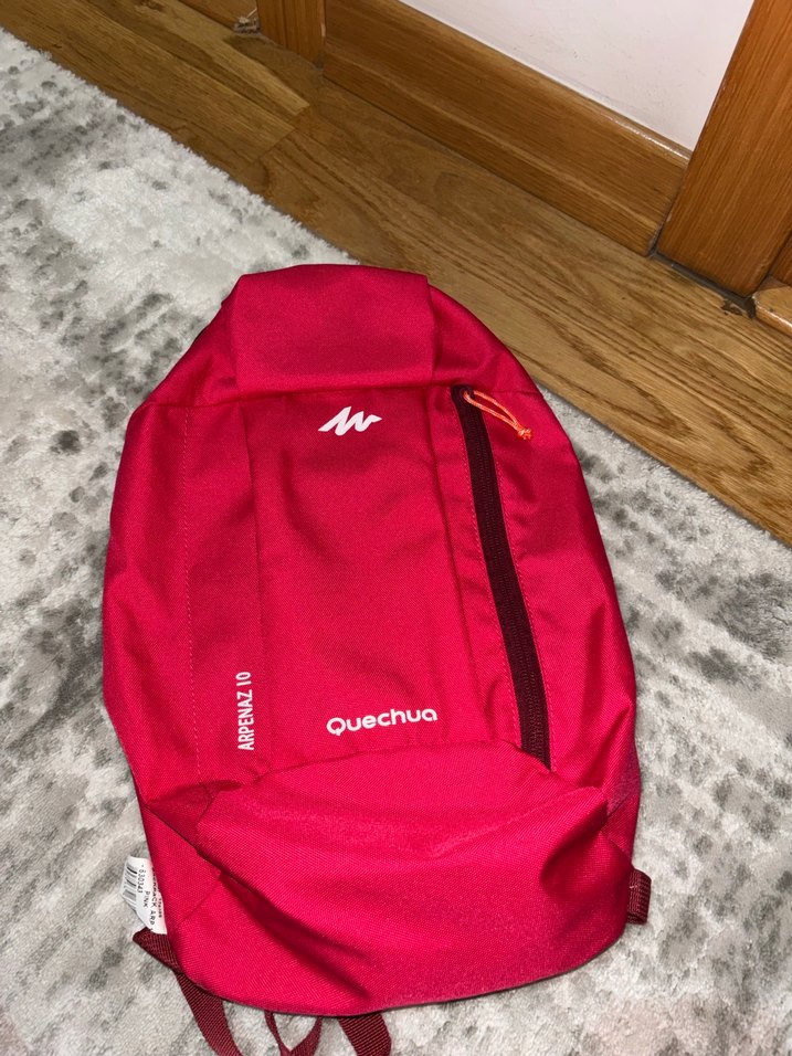 Quechua markalı kırmızı renkli, fermuarlı, baskılı desenli yumuşak ve rahat kumaştan yapılmış kadın sırt çantası. Outdoor ve sokak stili için uygundur.
