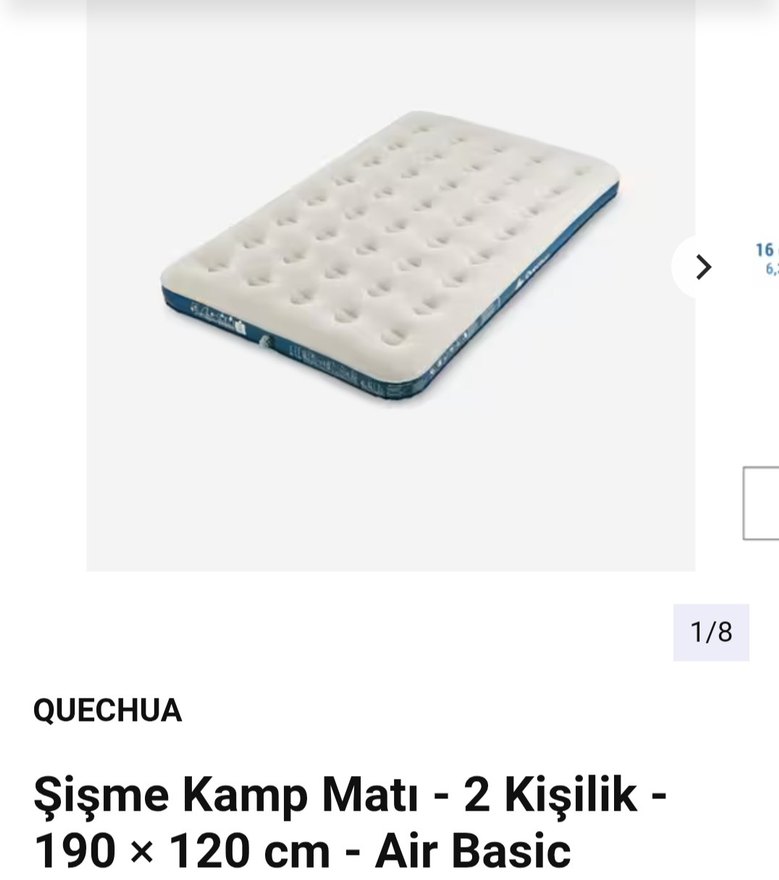 QUECHUA şişme kamp matı, 2 kişilik, 190 x 120 cm ölçülerinde, beyaz renkte ve düz yüzeyli. Temel hava dolgusu ile konfor sağlar. ️2-3 kere kullanıldı, büyük çadıra geçtiğimizi için büyük yatak alacağız.o yüzden satıyoruz