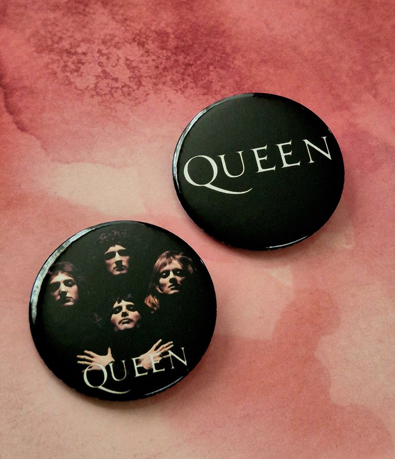 Queen grubunun logosu ve ikonik fotoğrafı bulunan siyah rock rozet seti, grunge punk tarzına uygundur.