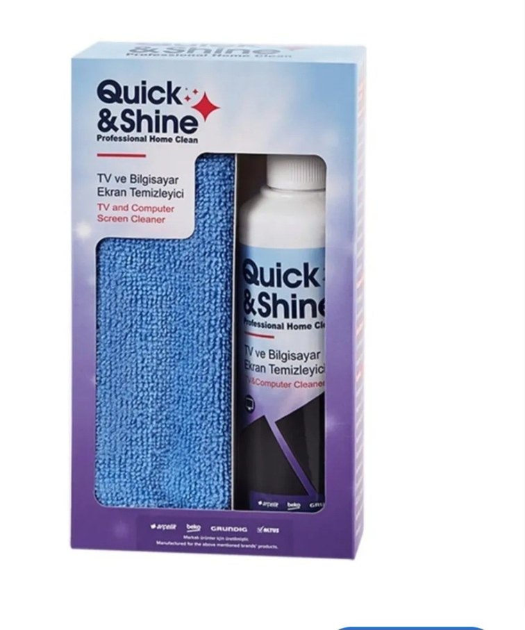 Quick & Shine ekran temizleyici seti, TV ve bilgisayar ekranlarını etkili temizlemek için temizlik solüsyonu ve mikrofiber bez içerir.