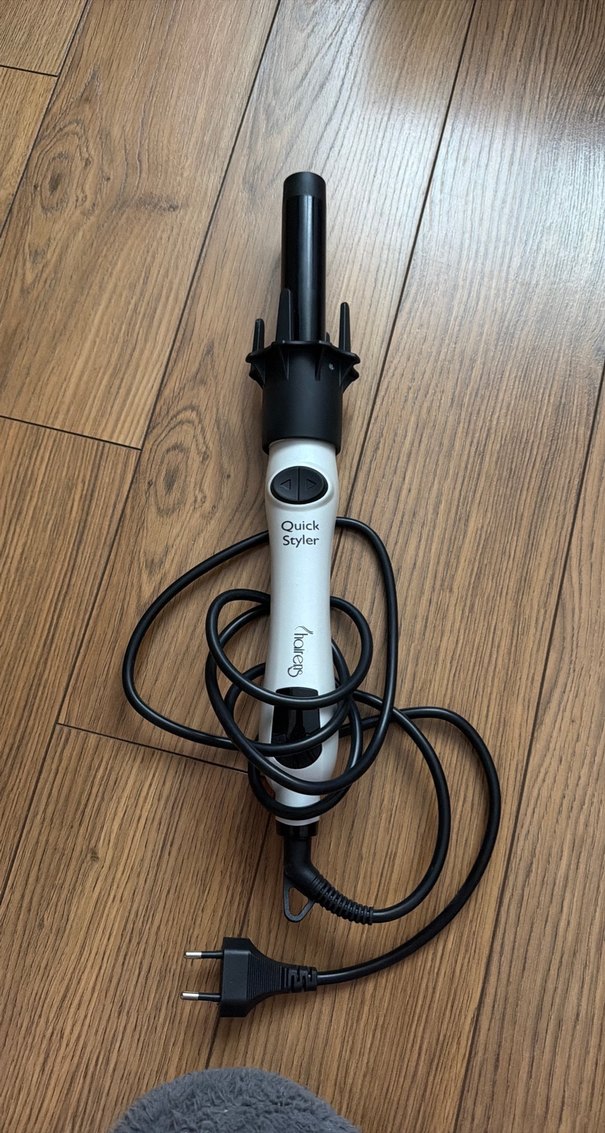 Quick Styler saç şekillendirici, gri ve beyaz renkte, kullanımı kolay düğmelerle donatılmıştır. Kablolu güç kaynağıyla sürekli ısı sağlar. ♀️