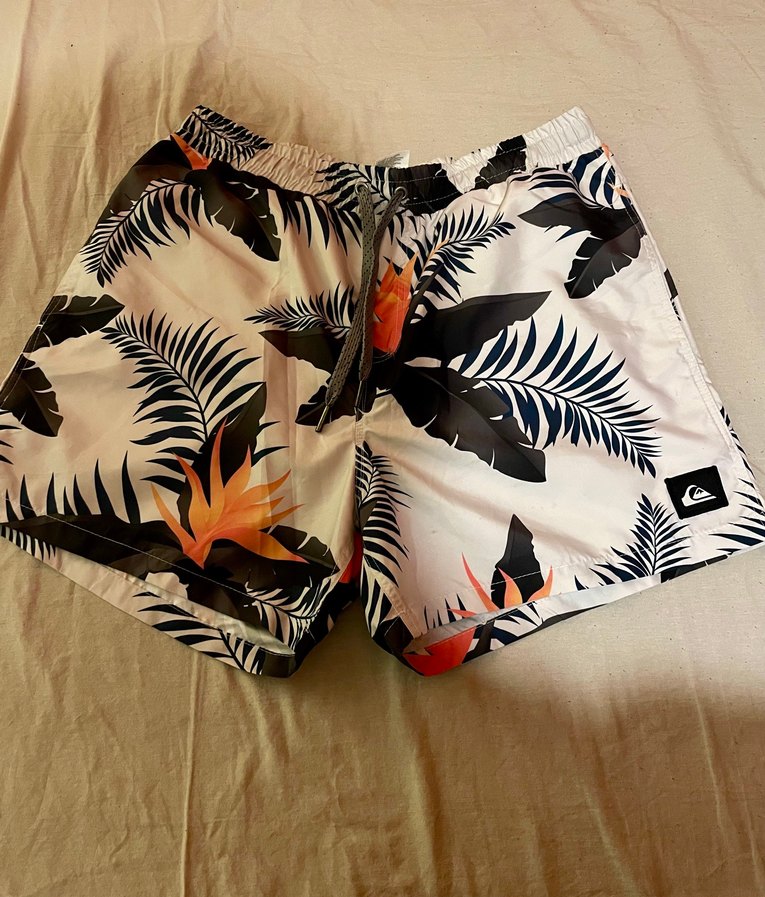 Ürün hiç kullanılamadı, yeni gibi, mağazasında 900 tl. Arkada cırt cırtlı cep, iç astarı mevcut Beyaz zemin üzerine baskılı tropikal desenli, bol kesim erkek mini şort mayo, plaj kullanımı için uygundur.