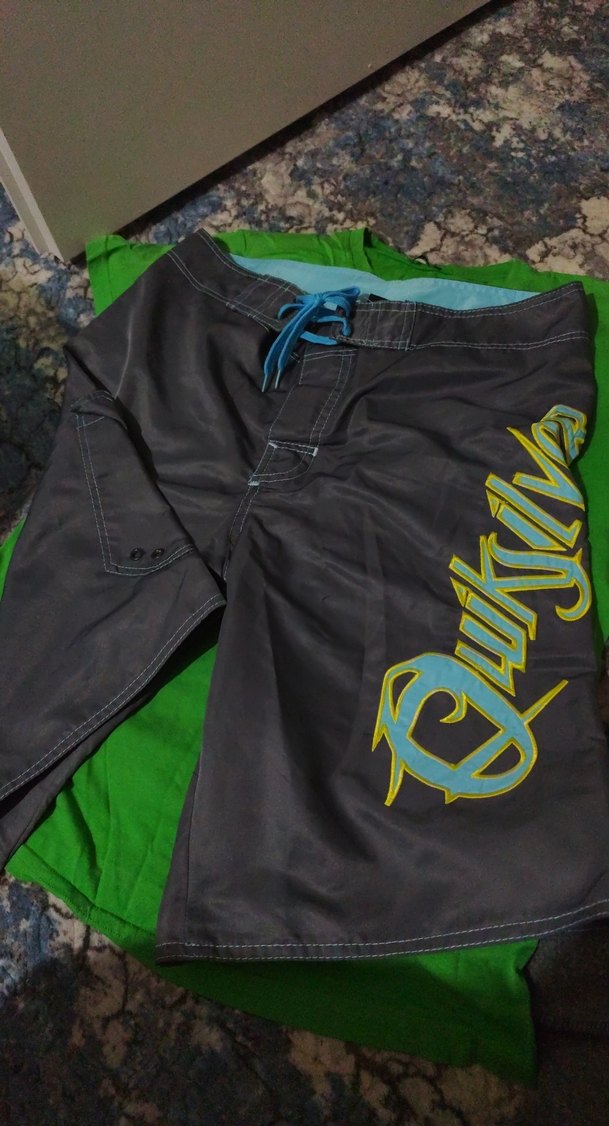 Quiksilver baskılı, tokalı bel detaylı, midi boy gri erkek deniz şortu. Sahil ve sokak stiline uygun, trend spor kesim.