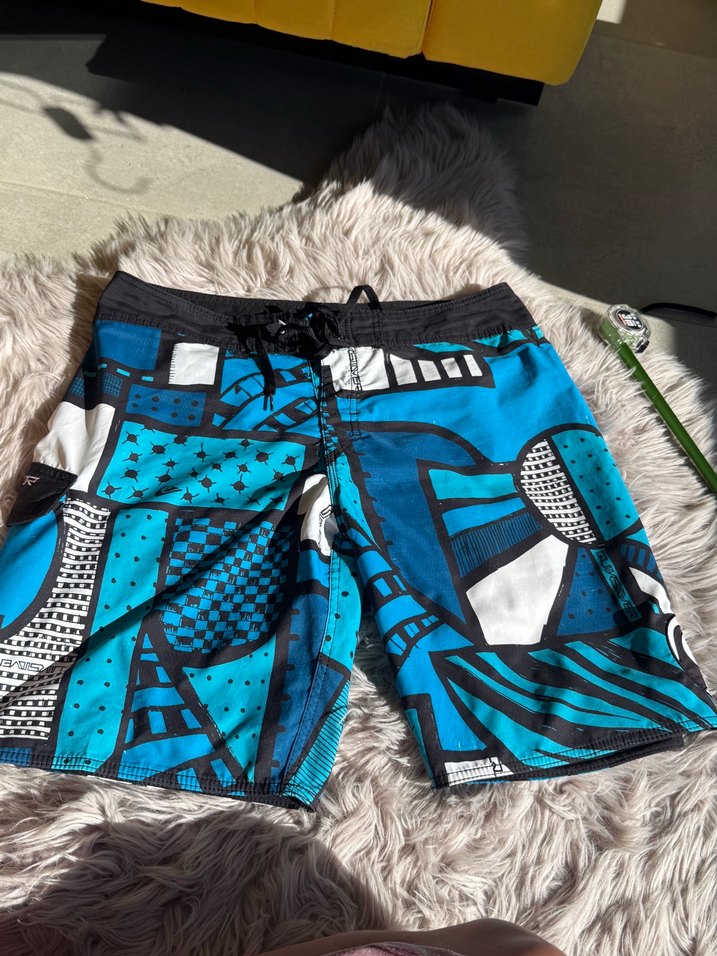 Desenli, lacivert erkek deniz şortu, rahat kesimiyle plaj için uygundur.