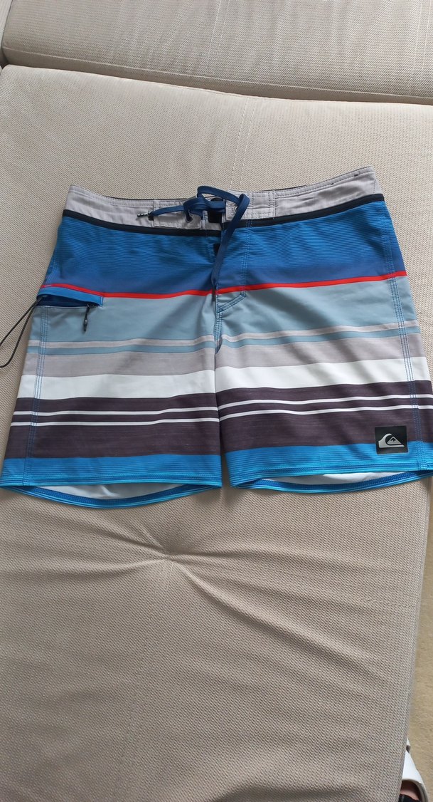 Quiksilver erkek mavi ve gri tonlarında, çizgili ve batik desenli kısa yüzme şortu. Bol kesim, kemerli ve fermuarlı cep özellikli, plaj ve günlük kullanım için uygundur.