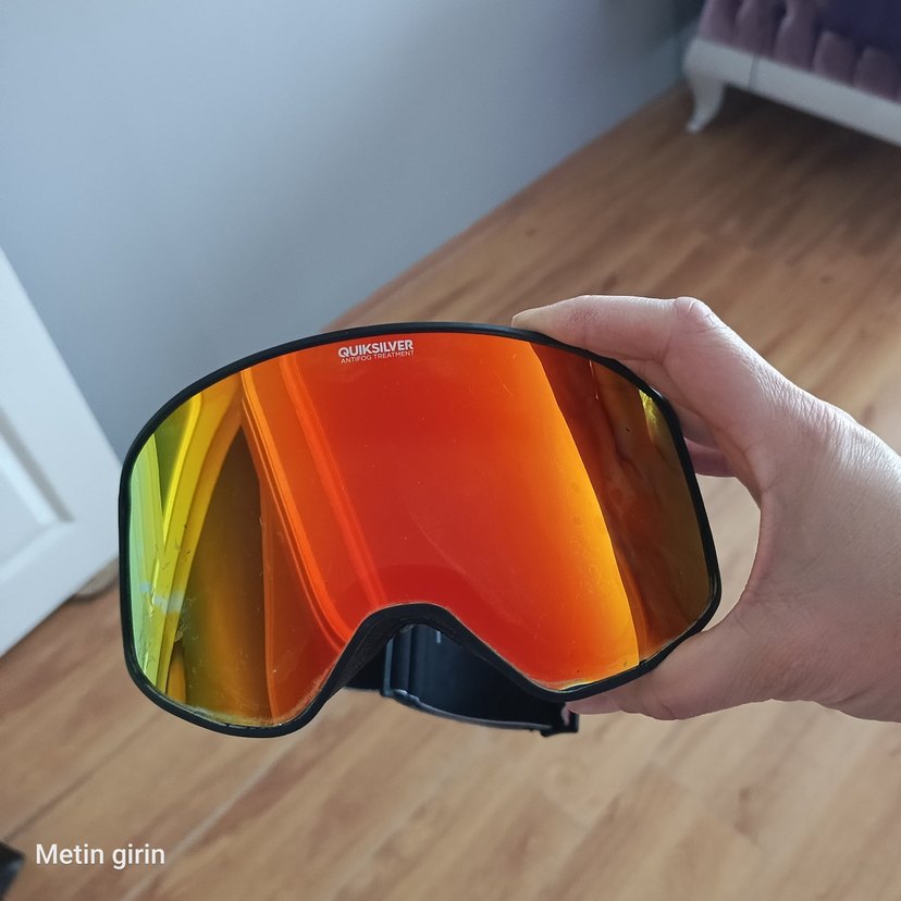 Quiksilver markalı erkek kayak gözlüğü, koyu ve minimalist tasarıma sahip, şeffaf turuncu cam lenslerle net görüş sağlar. camda çizik olabilir bilerek aşım yapınız görüşü engellemez