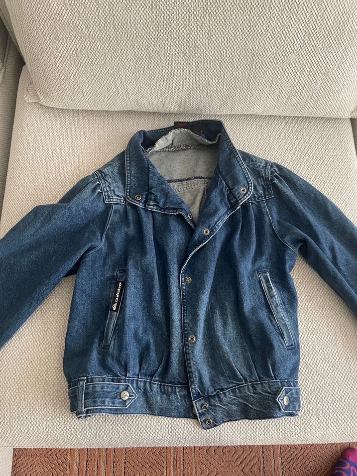 Düğmeli, uzun kollu ve kruvaze yaka tasarımlı mavi kot ceket. Rahat kesimi ve günlük sokak stiline uygun normal boyda.