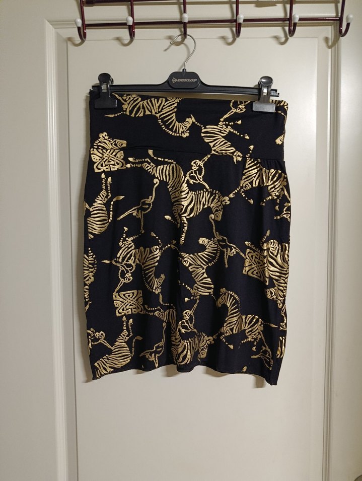 Pilili detaylara sahip, zebra desenli koyu altın renk mini hamile eteği. Günlük kullanım için avant-garde tarzda sokak modası uyumlu. yeni beden m