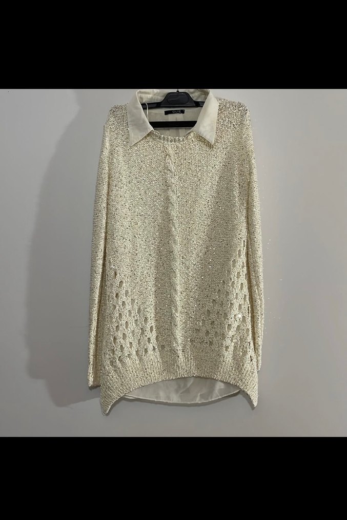 Bej renkli, uzun kollu, yuvarlak yakalı, gevşek kesim triko kazak. Günlük kullanıma uygun, rahat ve desen içermeyen tasarıma sahip. Yaka detayı ile şıklık katıyor. Sadece İki leke bir yakada ve başka aşağıda var.M-L bedeni uyumdur.
