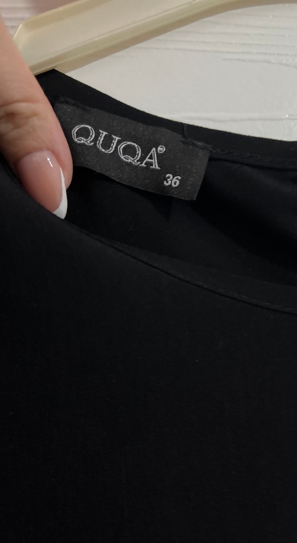 QUQA markalı, V yaka ve kısa kollu, düğmeli siyah hamile bluz. Sentetik kumaştan, baskılı ve günlük kullanıma uygun. Beden 36.