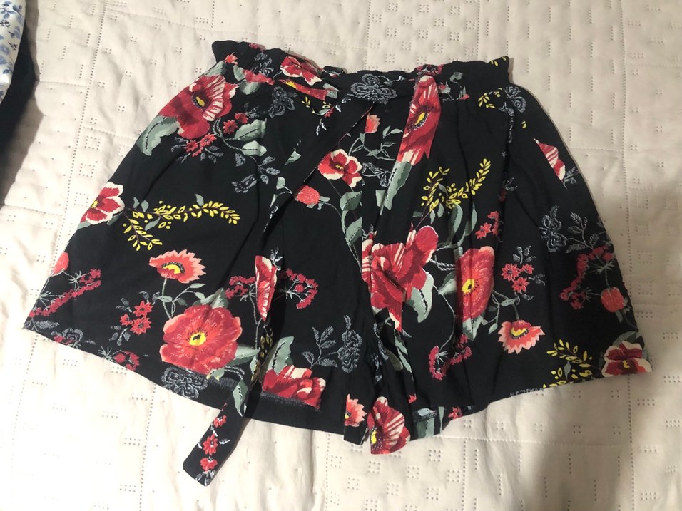 Koyu renkli çiçek desenli, volan detaylı, bol kesim mini şort. Bohem tarzda romantik akşamlar için uygundur.