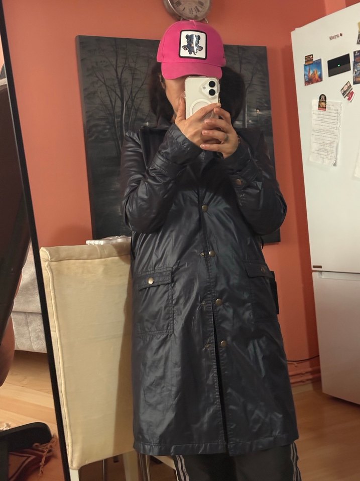 Düğmeli, lacivert deri midi yağmurluk, uzun kollu ve keskin yakalıdır. Trend sokak stiline uygun, şık ve rahat bir parçadır. ️( kemer mevcut değildir) Defo ❌