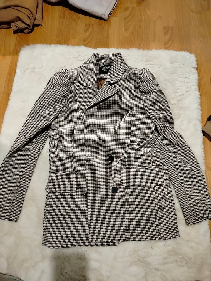 Gri ekose desenli, düğmeli, normal kesim, uzun kollu kadın blazer ceket, günlük sokak stili için uygundur. Boyu 70 cm eni 40 cm. Birkaç kez giyildi.