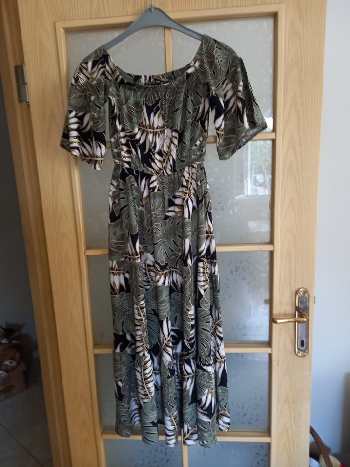 Ürün bir kere giyildi yepyeni tertemiz durumda..kısa kol desenli viskon poplin kumaş, 36 beden uyumlu, bel bölümü lastikli ( kemerle de kullanılabilir)omuz bölümü de lastikli olduğu için ayrıca açık omuz olarak da tercih edilebilir.. ölçüleri : iki kol altı kısım 40 cm.kol boyu 26 cm. bel lastikli olduğu için 40 cm e kadar esniyor. boy omuz itibariyle 124 cm.