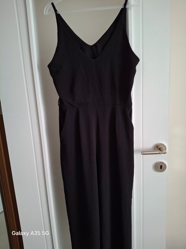 Siyah renkli, V yaka ve kolsuz tasarıma sahip, vücuda oturan tulum, romantik akşamlar için minimal goth tarzı sunar. ✨